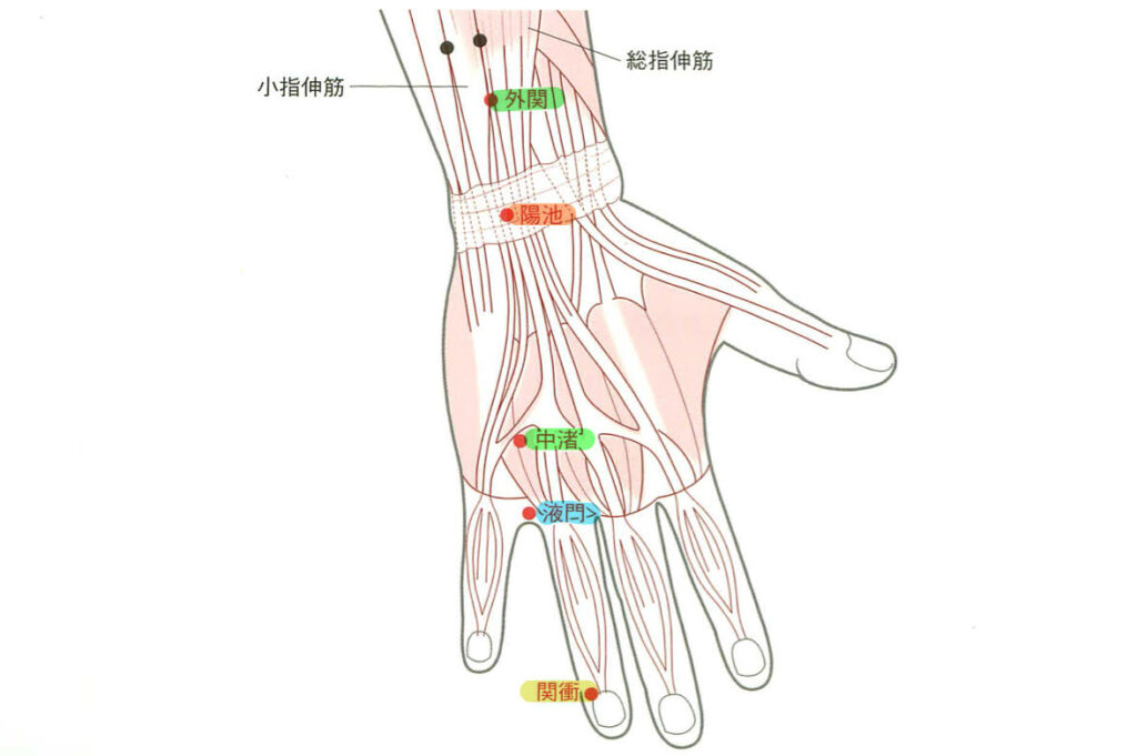 手の甲、第4・5中手骨の間でこぶしを握り指でたどり止まる陥凹部にある。
